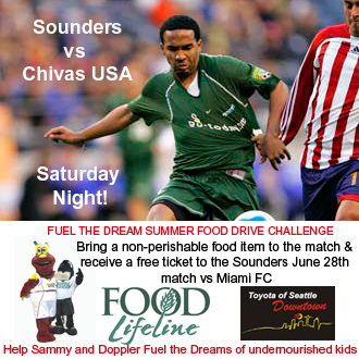 Seattle Sounders fans who bring a non-perishable food item or cash donation to Saturday night’s 7pm exhibition match between the Sounders and Chivas USA of Major League Soccer will not only help the Sounders win the “Fuel the Dream Summer Food Drive Challenge” between the Sounders and the Seattle Storm, but will also receive a free ticket to the June 28th Sounders home match against Miami FC.